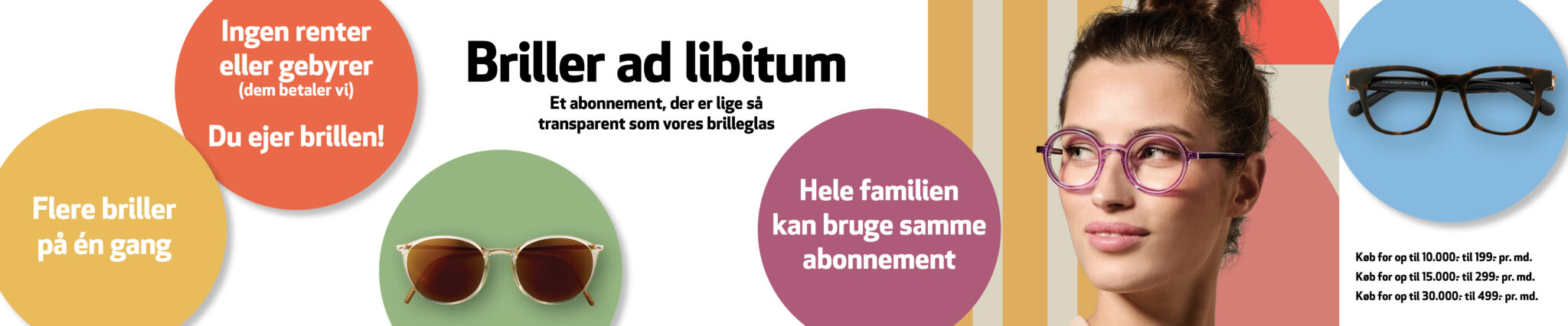 Vores helt normale brilleabonnementsordning som her kan også erstattes med vores “Briller ad libitum”, som også er briller på abonnement, men på en lidt anden måde, måske endda mere fordelagtig.